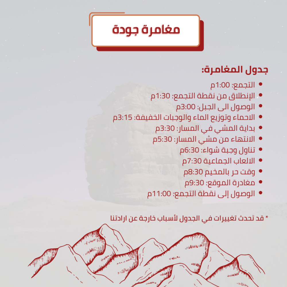 بعد الوصول الى جودة سوف نستمتع بالمشي في أودية وقمم الجبال وبعد ان يحل المساء سوف نستمتع بالجلوس حول النار وشرب المشروبات الدافئة والالعاب الجماعية وبعد ذلك سوف نستمتع بوجبة العشاء التي تتكون من ذرة مشوية وبرقر مشوي